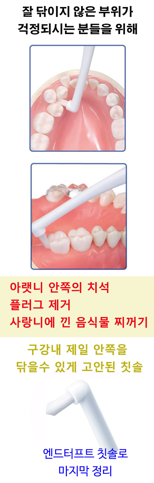 일반칫솔로 닦이지 않는 부분을 깨끗이 닦아내줍니다.