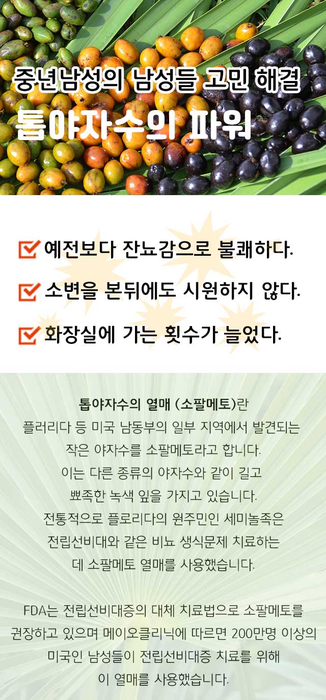 중년 남성의 배뇨·개운함 관리에 도움을 주는 노코기리야시 추출물을 1일 섭취량(2정 기준)으로 320mg 배합