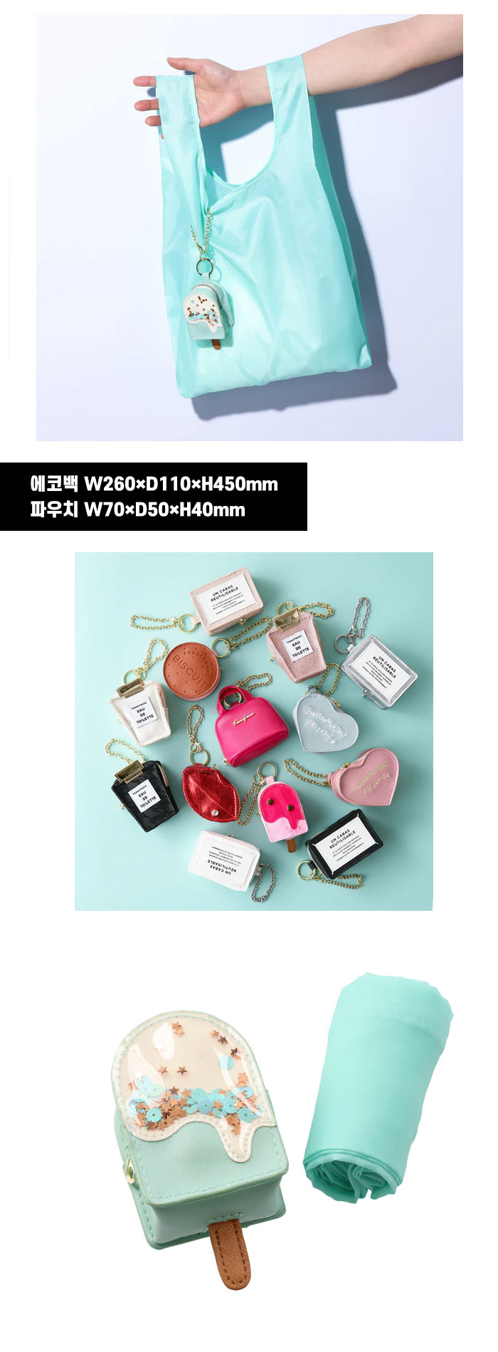 • Francfranc 프랑프랑 키홀더 접이식 에코백 (수납 참 포함)아이스크림 라이트민트