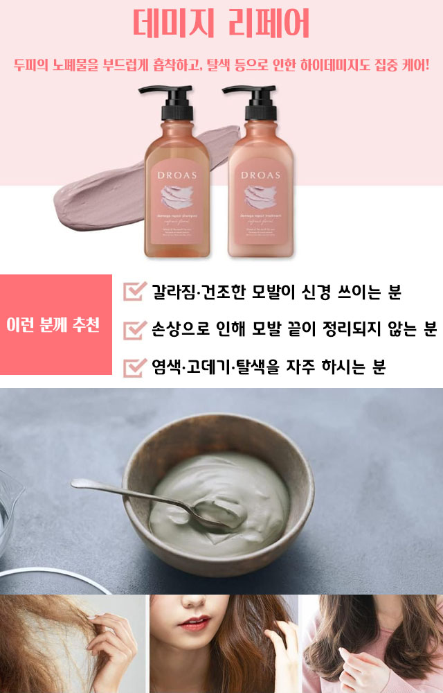 드로아스 데미지 리페어 세트는 손상 케어 × 매끈 윤기 머릿결을 원하는 분께 추천드립니다.