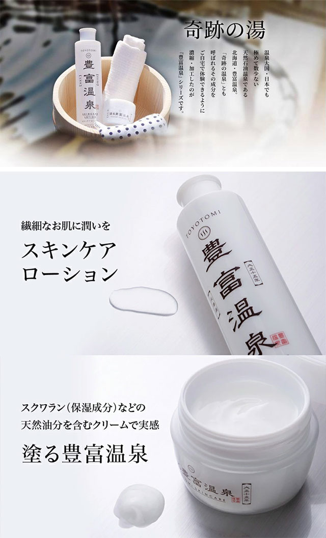 홋카이도 도요토미 온천의 촉촉한 성분을 그대로 담은 보습 집중 스킨케어 세트.