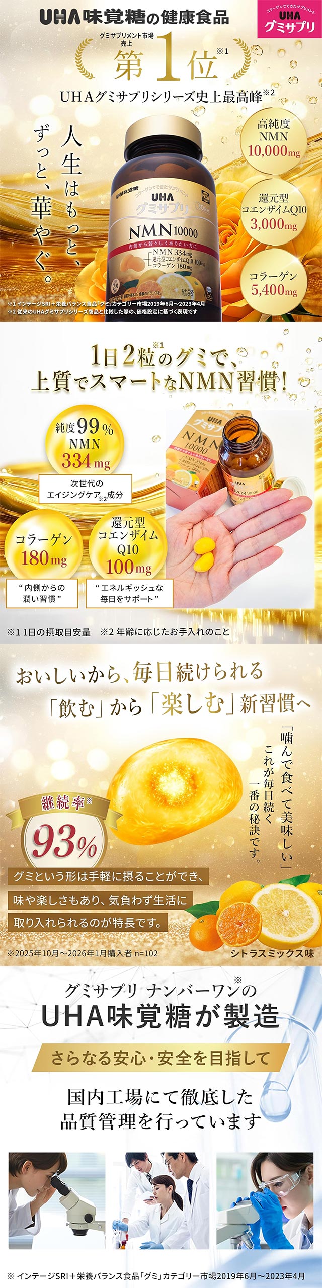 🔹 특징 ・하루 2정으로 간편한 NMN 섭취 ・고순도 NMN 배합 ・코엔자임Q10 & 콜라겐 함유 ・맛있게 즐기는 구미 타입