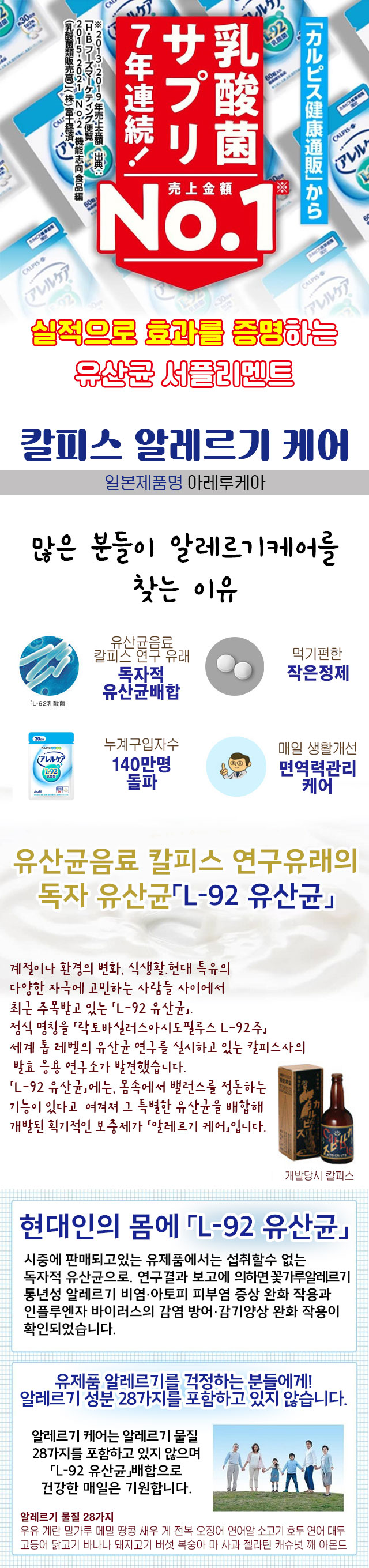- home > 건강보조식품 > 면역/유산균/장건강 > 칼피스 알레르기 케어 120정(60정x2개) 파우치 (L-92 유산균 배합) 아레루케어
