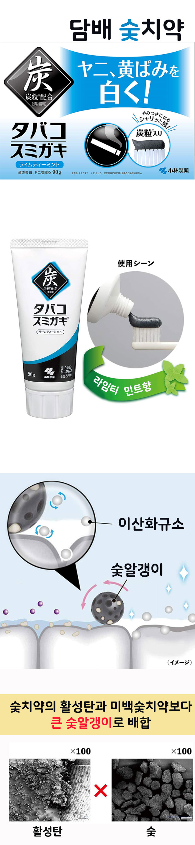 ✅제품 특징 ● 탄분(숯) + 실리카 세정 파워 미세한 숯 입자와 실리카가 치아 표면에 붙은 니코틴 얼룩·황변을 효과적으로 제거 흡연으로 인한 치아 착색을 줄여 자연스러운 본래의 하얀 치아로 ●구취·냄새 케어 숯 + 실리카가 니코틴 냄새 원인 성분을 흡착·제거 매 사용 후 상쾌하고 개운한 구강 유지 ●라임티 민트향 담배 특유의 구취를 덮어주고, 깔끔하고 산뜻한 사용감 ●파라벤 프리 민감한 분도 안심하고 사용 가능 ✅효능/효과 치아 표면 착색(니코틴·커피·차 얼룩 등) 제거 자연스러운 미백 효과 구취 제거 및 예방 상쾌한 구강 환경 유지