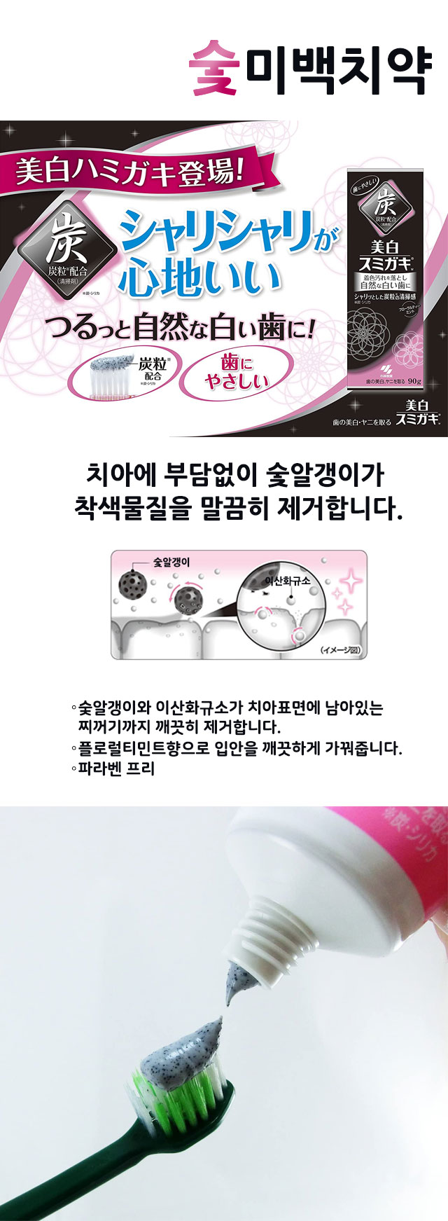 ●탄분(숯) + 실리카 클리어 효과 ●구강 상쾌감 & 미백 효과 ●파라벤 프리 처방