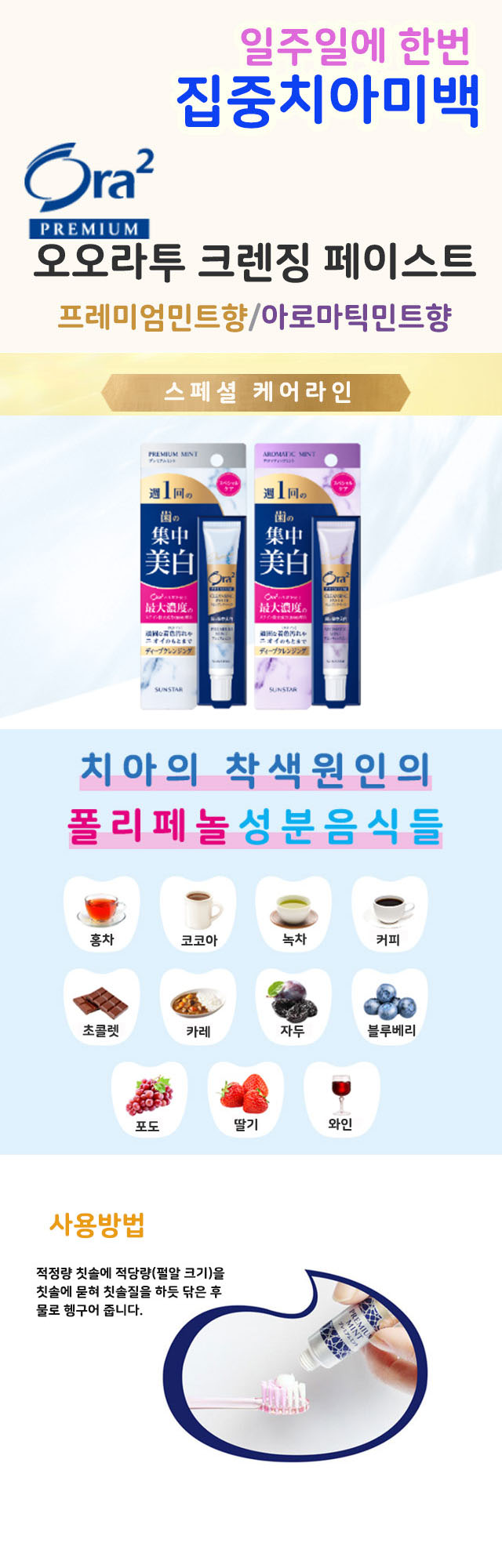 ✅효능/효과 화이트닝작용, 진을 제거, 치석의 침착을 방지 사용방법 적당량(펄알 크기)을 칫솔에 묻혀 보통 칫솔질을 하듯 닦은 후 물로 헹구어 줍니다. 특히 스테인(착색 오염)이 신경 쓰이는 부분 닦기에도 사용할 수 있습니다. 본 제품은 치아의 스테인을 떨어뜨리데 탁월한 치약입니다.주 1회 정도의 사용을 권장합니다.