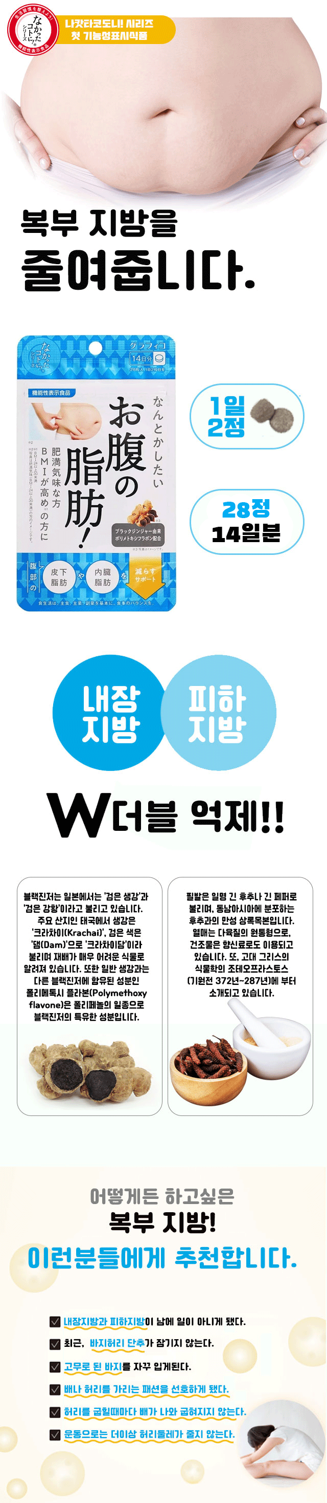 <신고번호> E825<신고표시> 본 제품에는 블랙진저 유래 폴리메톡시 플라본이 포함됩니다. 블랙진저 유래 폴리메톡시 플라본은 일상 활동 시 에너지 대사에서 지방을 소비하기 쉽게 하는 작용으로 비만이 있는 분, BMI가 높고(BMI 24 이상 30 미만) 복부의 지방(내장지방 및 피하지방)을 줄여주는 기능이 있는 것으로 보고되었습니다.