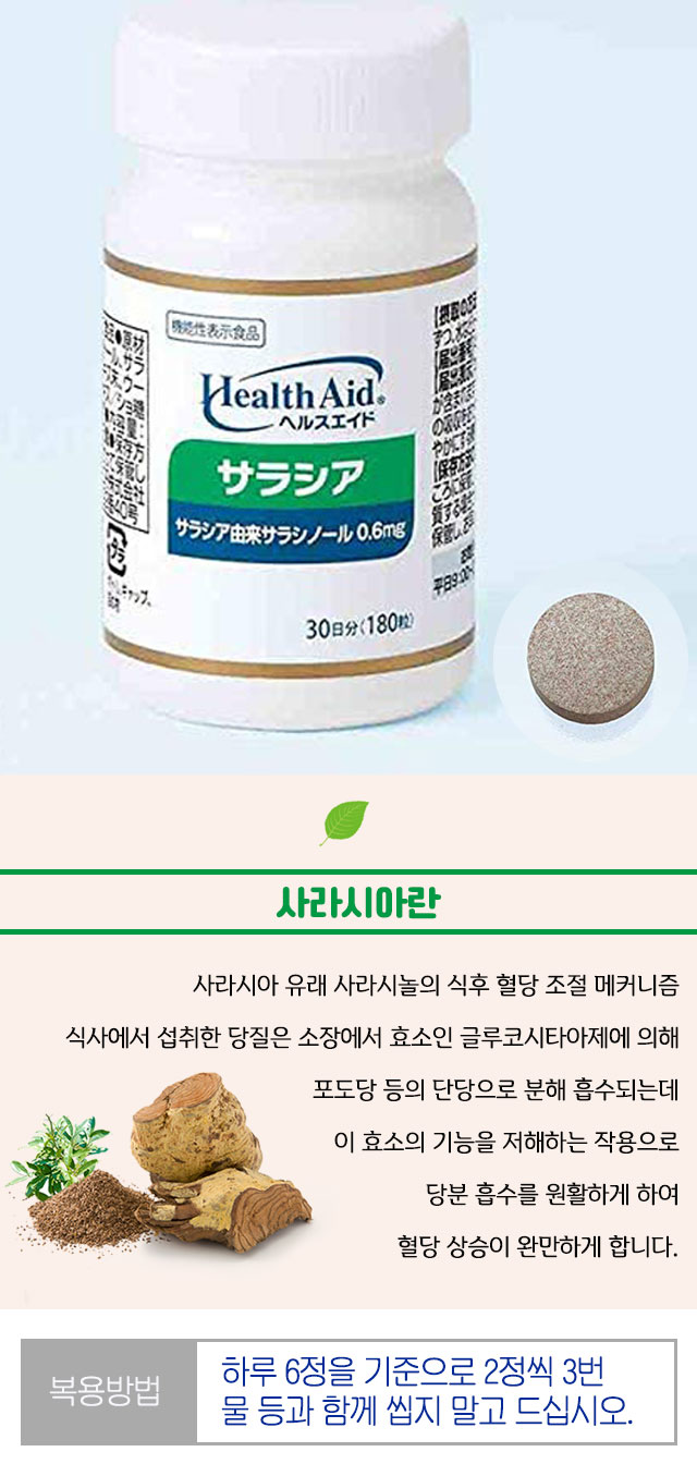 모리시타진탄 사라시아 30일분 (180정) 내용량 180정 제품분류 영양기능식품 제품특징 식후 혈당치나 당의 흡수가 신경 쓰이는 분에게 적합합니다. 사라시아 유래 사라시놀 0.6mg 함유. 사라시아 유래 사라시놀은 당의 흡수를 억제하고 식후 혈당 상승을 완만하게 하는 기능이 있다고 보고되었습니다. 용법/용량 1일 6정을 기준으로 식사마다 2정씩 물 등과 함께 씹지 말고 드십시오. 하루 섭취 기준량을 지켜 주십시오. 당뇨병 약을 사용하는 분은 사용 전에 의사·약사와 상담해 주십시오. 성분/함량 말티톨, 에리스리톨, 사라시아 추출물, 로즈마리 추출물분말, 우롱차 추출물분말, 톤부리 추출물 / 쇼당에스테르, 미립산화규소. 영양성분 표시 (6정/1.8g당) 에너지 3.8kcal 단백질 0.043g 지질 0.047g 탄수화물 1.6g 식염 상당량 0.0056g 로즈마리 추출물분말 200mg 우롱차 추출물분말 180mg