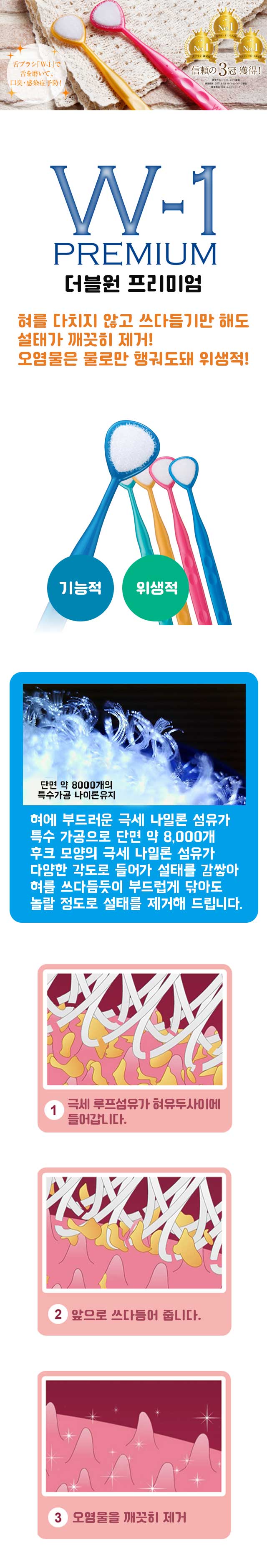 ●단면 약 8천 개의 후크 모양으로 특수 가공된 초극세모가 혀의 오염을 제거하는 혀 클리너입니다. ● 기존의 W-1 루프 섬유의 모양을 후크 형태로 바꾸어서 혀 청소 후 브러시의 오염이 흐르는 물에 잘 지워지고 오염이 침착되지 않게 되었습니다. <사용상의 주의> |