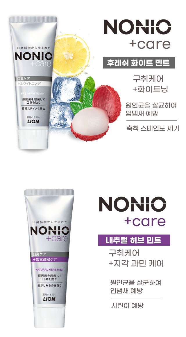 구취 케어 + 화이트닝 두 가지를 동시에 잡고 싶은 분께 추천하는 NONIO 플러스 화이트닝 치약입니다! 노니오 NONIO 플러스 화이트닝 치약 130g 프레시 화이트 민트 · 고농도 불소 1450ppm[의약부외품]