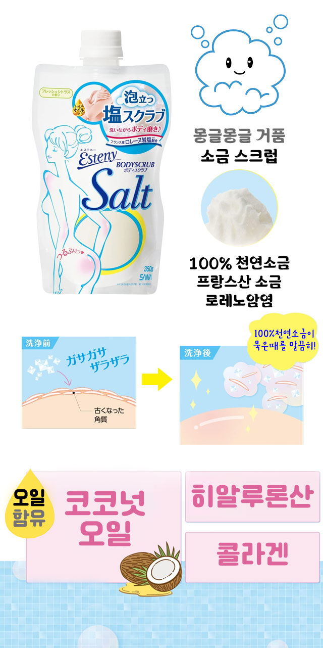 상품소개 수량 한정 상품 거품이 일어나는 소금 스크럽 씻으면서 바디 닦기 부드럽게 감싸지는 금목서의 향기 ○오래된 각질제거 프랑스산 로렌 암염 ※1 식물유래 세정성분 ※2 ○ 피부 수분 보호 오일 ※3200%※4in<코코넛 오일> 씻어낸 촉촉함 콜라겐 ※ 5 히알루론산 ※ 6 ○ 천연유래 보습성분 걸쭉한 꿀※7함유 ※ 1 미네랄 소금 (스크럽제), ※ 2 코카미도 프로필베타인, ※ 3 야자유 (보습성분), ※ 4 사나 에스테니 솔티스크럽과의 비교에서(당사비), ※5 석시노일 아테로콜라겐(보습성분), ※6 히알루론산Na(보습성분), ※7꿀(보습성분) 사용방법 (1) 피부를 잘 적신 후 적당량을 신경 쓰이는 부위에 바르고 동그라미를 그리며 부드럽게 마사지해 주세요. (미지근한 물을 조금씩 첨가하면 거품이 생깁니다.) (2)그 후, 잘 씻어 주세요. 1.손바닥 전체로 엉덩이 2. 손가락 배로 팔 팔꿈치 3. 엄지와 검지 사이에서 발 무릎 <사용량의 기준> [1회분 기준] 온몸 탁구공 1~2개 크기 안전 경고 눈에 닿지 않게 해주세요. |