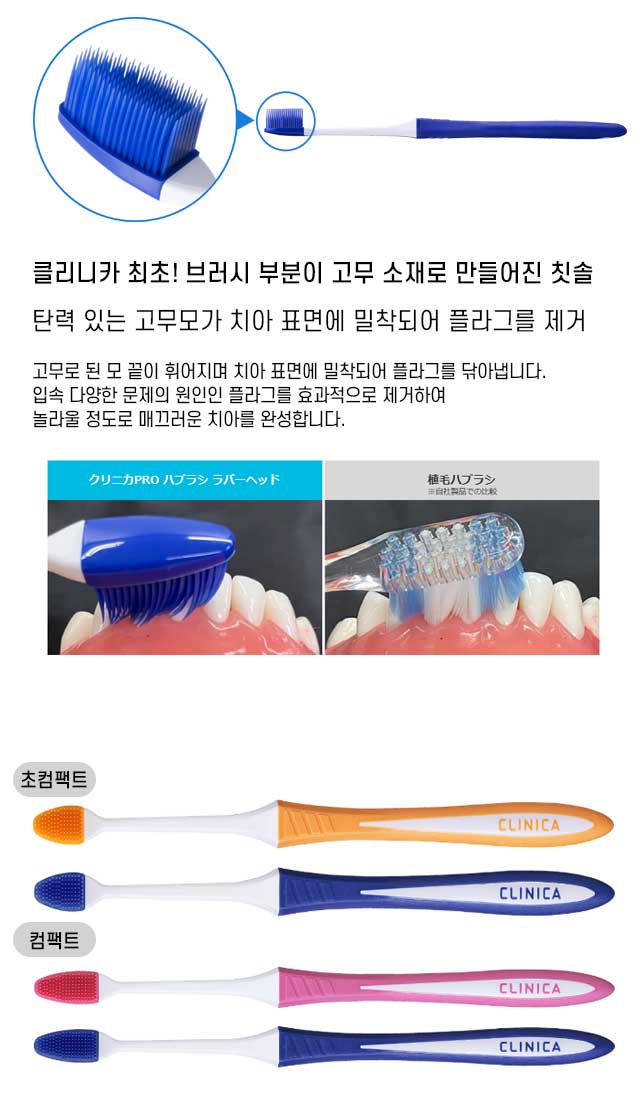 상품소개 클리니카 최초, 브러시 부분이 고무 소재로 된 칫솔 탄력 있는 고무모가 치아 표면에 밀착해 치태(프라그)를 깨끗하게 제거, 매끈한 마무리 부드러운 모끝으로 잇몸 부담 없이 구석구석 편안하게 양치 가능 얇은 헤드 & 슬림 넥으로 입안에서 움직이기 편리