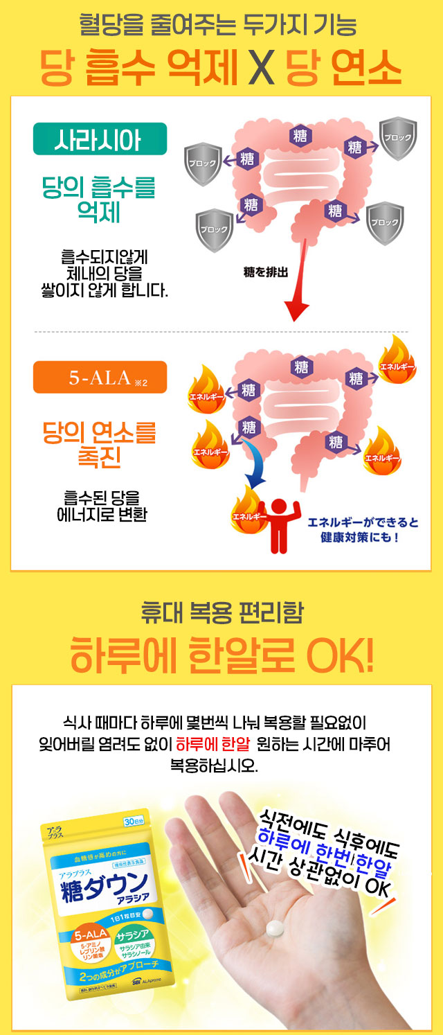 사라시아가 당의 흡수를 억제하고, 5-ALA(5-아미노레불린산)가 당을 에너지로 전환시키는 대사를 활성화하는 데 도움을 주는 건강기능식품입니다.