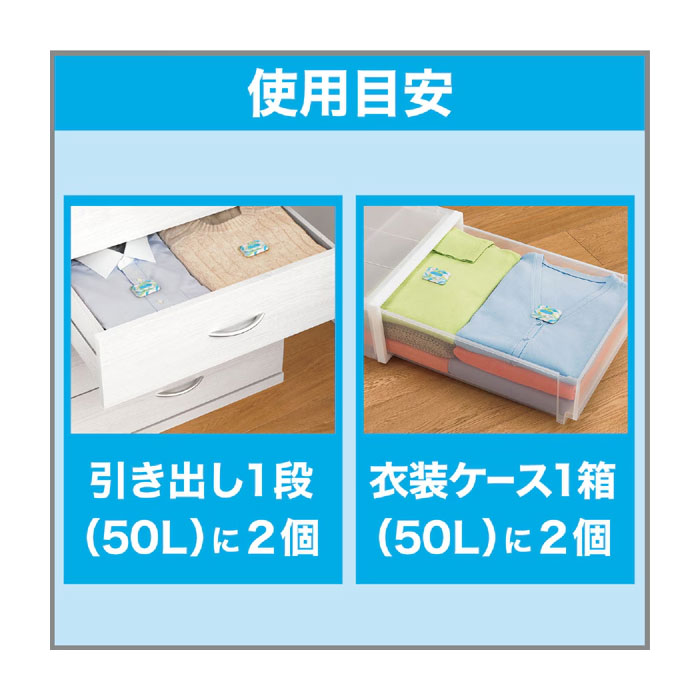 〇제품 특징-소중한 의류를 확실하게 방충약 1년 동안 안정적인 방충 성분이 효과를 발휘하여,카시미아·울 등 고급 섬유도 안심하고 보호할 수 있습니다.