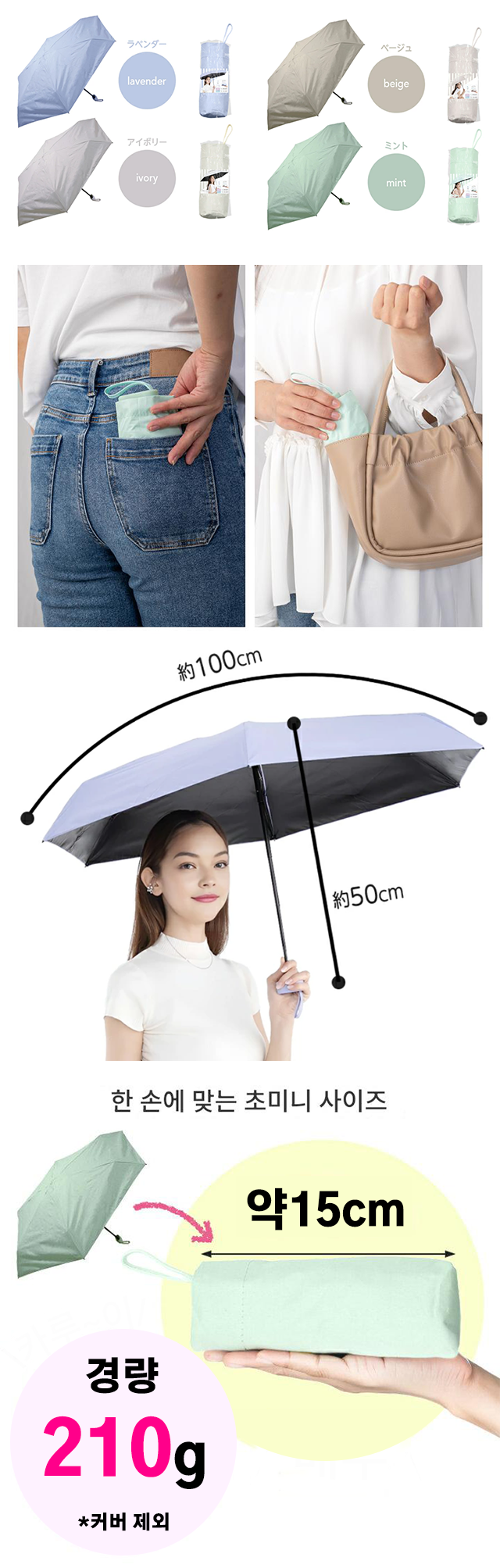 한 손에 쏙 들어오는 초미니 사이즈! ☑️약 15cm, 무게 210g (커버 제외 기준) ☑️UV 차단율 99.9% 이상 ☑️더위 대비 ☑️맑은 날 / 비 오는 날 겸용 ☑️남녀 공용 ☑️남성에게도 추천! ☑️컴팩트해서 비즈니스 가방에도 쏙, 갑작스러운 비에도 걱정 없음 ☑️주머니나 미니백에도 쏙 들어가는 크기 ☑️작지만 충분히 넓게 펼쳐지는 사이즈감 【상품명】 Mini 카와 양산 (미니 귀여운 양산) 【컬러】 라벤더 / 아이보리 / 베이지 / 민트 / 하늘색 【소재】 우산 원단: 폴리에스터 100% 【사양】 살대: 6개 UV 차단율: 99.9% 이상 【상품 크기】 수납 시: W7 × D4 × H15cm 살대 길이: 50cm 중간대(폴대): 50cm 손잡이: W5.5 × D2.5 × H2.3cm |