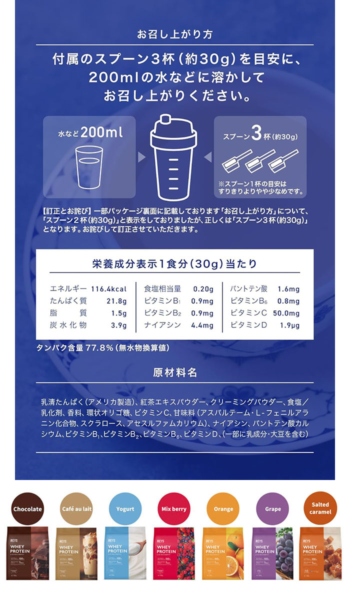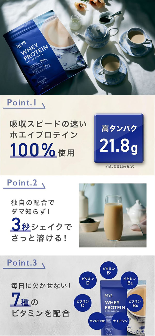 제품 포인트 POINT 1. 매일 마시고 싶은 맛 REYS만의 독자적인 배합으로 부드럽고 깔끔하게 잘 녹습니다. POINT 2. 유청 단백질 사용 단백질 원료로 흡수 속도가 빠른 WPC(유청 단백질)를 사용했습니다. POINT 3. 7가지 비타민 함유 비타민 B군 5종 + 비타민 C + 비타민 D를 함유하여 POINT 4. 3초 셰이크 독자 배합으로 빠르게 녹아 뭉침이 생기지 않고 부드러운 맛을 구현 팁: 물을 먼저 넣고 단백질을 넣은 뒤 셰이크하면 더욱 잘 녹습니다.