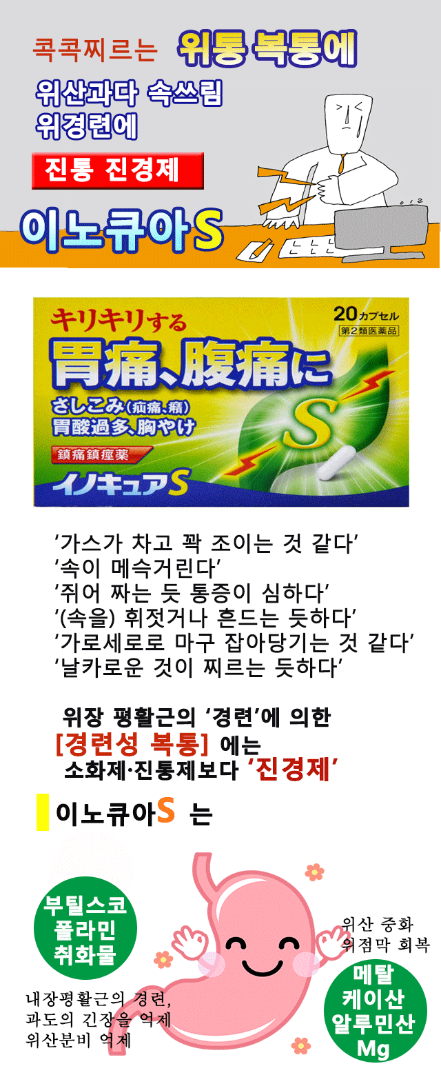 위나 장을 움직이는 내장 평활근이 경련이나 과도의 긴장에 의해, 위통, 복통, 배앓이 등의 증상이 나타납니다. 이노큐어S는 브틸스코포라민취화물이 내장 평활근의 경련이나 과도의 긴장을 억제함과 동시에 위산의 분비를 억제합니다. 게다가 메타케이산 알루민산 마그네슘이 위산을 중화시켜 위점막을 보호함으로서 위통 배앓이 속쓰림 등의 위장증상에 뛰어난 효과를 발휘합니다.