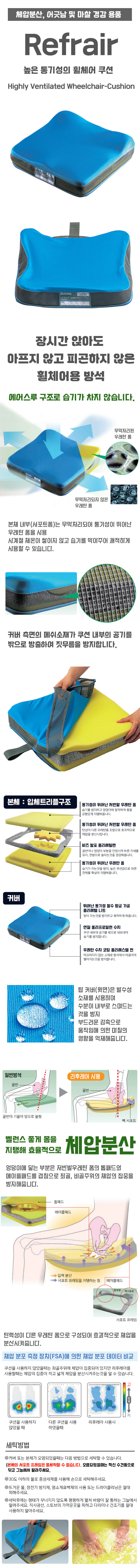 <사용방법> ○앞뒤를 잘 확인하여 좌석에 놓고 사용하십시오. (커버에 있는 '앞' 표기가 휠체어 좌면의 전면이 되도록 놓아 주십시오) ○본 제품 위에는 아무것도 걸지 마십시오. (체압 분산의 효과가 발휘되기 어려워집니다. 또 어긋남의 원인이 되기도 합니다) ○본 제품은 체압의 분산·짓무름을 줄이는 것을 목적으로 하고 있지만 사용자의 활동성·키·체중 등에 따라 그 효과 및 그 내용 내구성의 년수가 달라질 수 있습니다. |