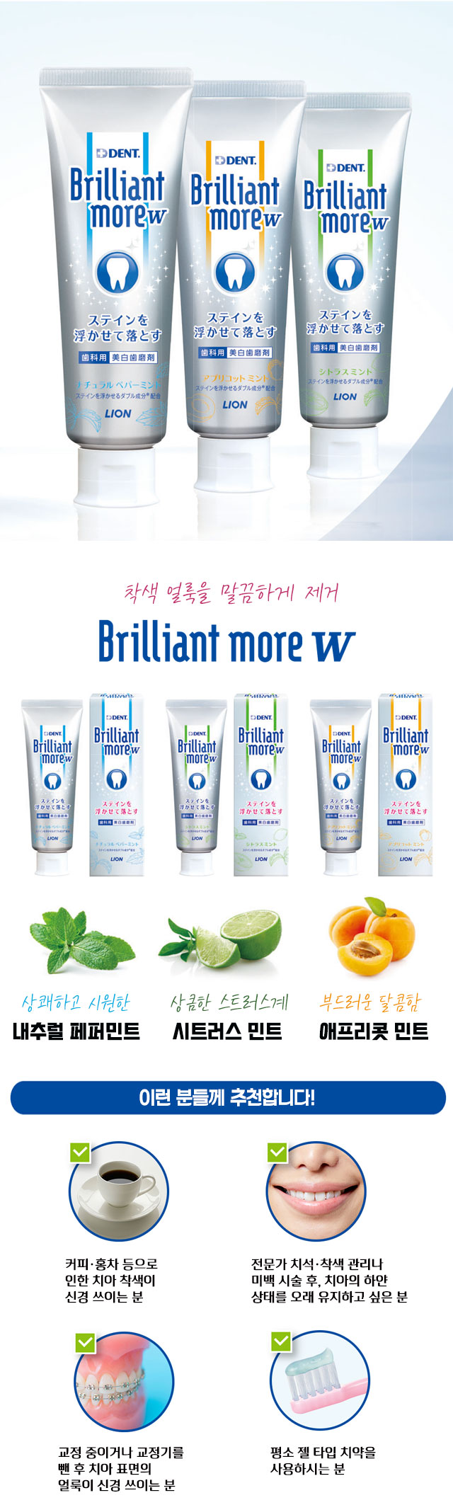 - home > 생활용품 > 구강(치약/칫솔/가글) > 기능성 치약 > 브릴리언트 모어 W 애프리콧 민트 90g 약용 화이트닝 치약 라이온 LION