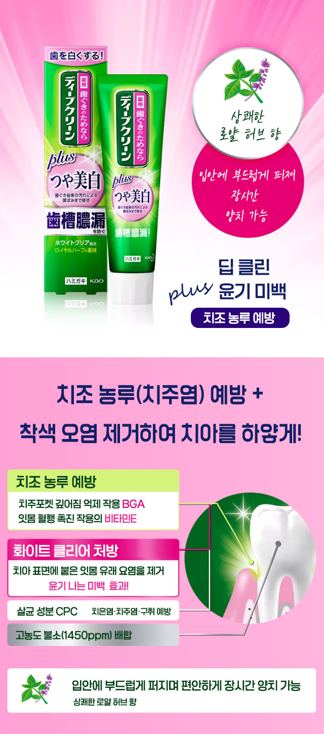 🦷 딥클린 약용 윤기 미백 치약 100g 로열 허브향 카오 ✅제품 특징