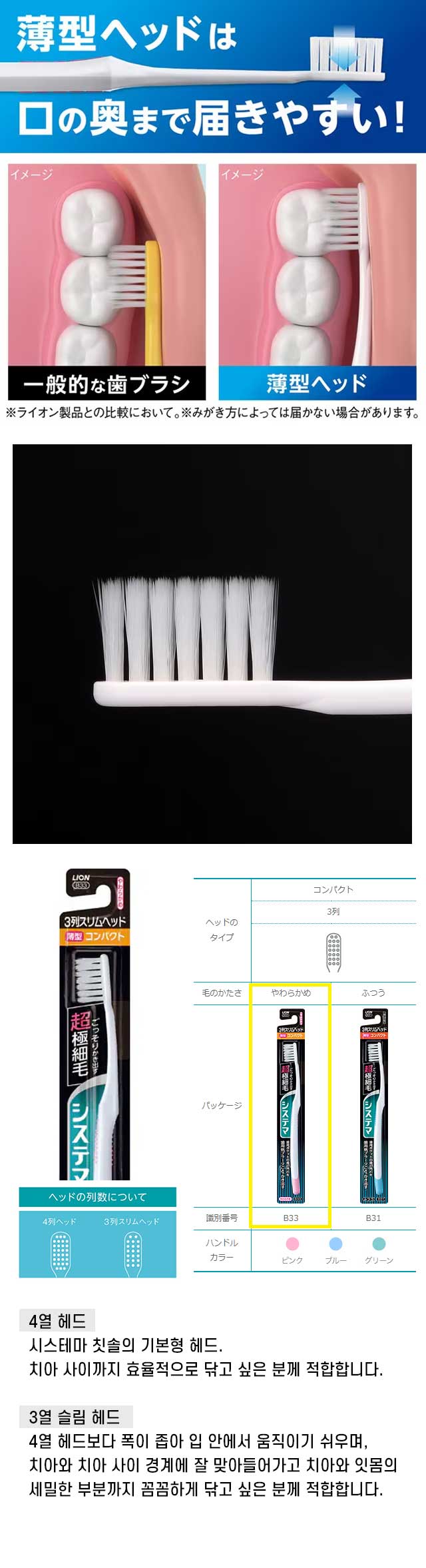 > 시스테마 컴팩트 헤드 3열 극세모 부드러운모 X5개세트 보통모 B33 색깔랜덤