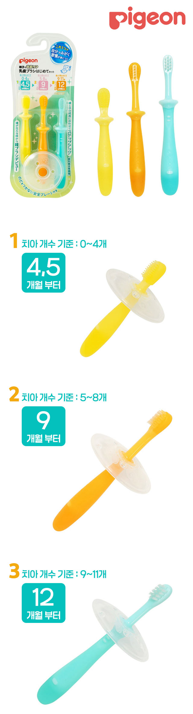 아기가 이가 나기 전 → 앞니가 날 때 → 어금니가 날 때 자연스럽게 단계를 밟으며 양치 습관을 익힐 수 있는 Pigeon 유치 브러시 처음세트 🪥