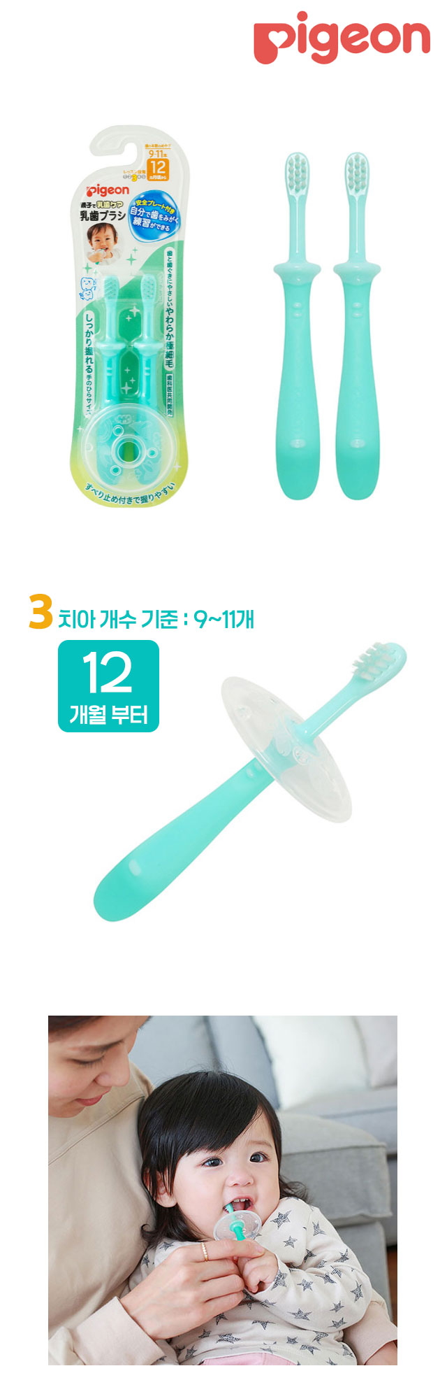 아기가 어금니가 나기 시작하는 시기에 스스로 양치 습관을 키울 수 있는Pigeon 유치 브러시 레슨 단계 3 🪥