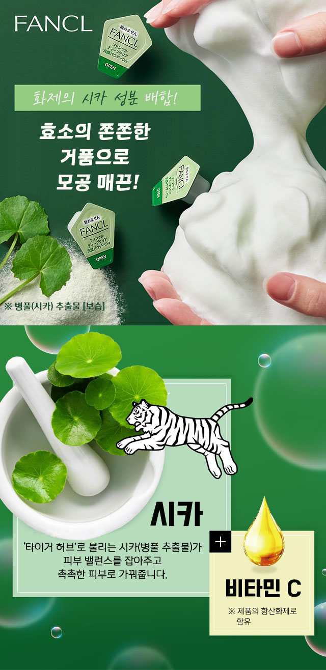 1. 모공 속 노폐물을 “효소 + 클레이 + 탄”으로 클리어 *단백질 분해 효소(프로테아제)*가 각질과 피지를 녹여내고 *클레이(카올린·파이로필라이트)*와 *숯(탄)*이 피지를 흡착해 모공 깊숙한 블랙헤드까지 말끔히 제거합니다. 부드럽고 미세한 파우더가 물과 만나 풍성하고 쿠션감 있는 쫀쫀한 거품으로 변하며 자극 없이 세정합니다. 2. 병풀(CICA) × 비타민C 유도체(VC)로 진정 & 투명 케어 *병풀추출물(센텔라 아시아티카 추출물)*이 세안 중 자극받은 피부를 진정시켜 세정 후에도 편안한 피부 컨디션 유지 *비타민C 유도체(아스코빌인산Mg)*가 피부톤을 맑게 정돈해 세안 후 투명하고 화사한 피부로 가꿔줍니다.