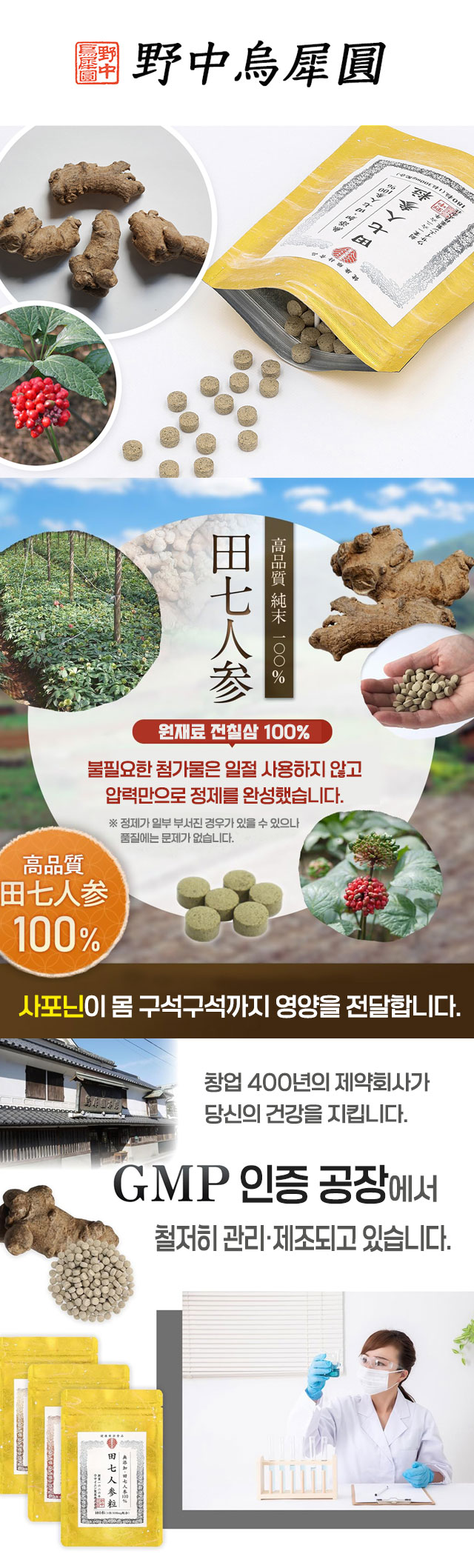 ● 전칠삼 100% 무첨가 압축정제 ● 무착색 / 무보존료 / 무결합제 ● GMP 인증 일본 국내 공장 생산 ● 잔류농약·중금속·미생물 검사 통과 원료만 사용