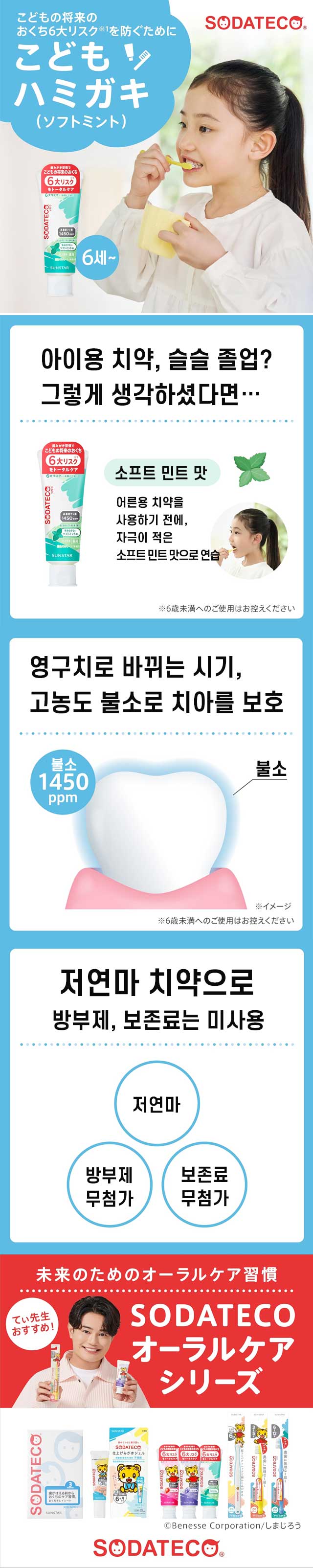 선스타 소다테코 어린이 치약 소프트민트맛 70g [의약외품 불소1450ppm 함유 초등생용]X3개세트