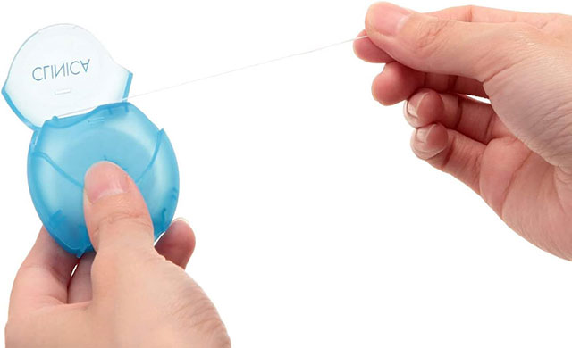 1. 플로스를 약 40 cm 정도로 잘라 양손 중지에 감고 약 15 cm 로 팽팽히 잡습니다.
