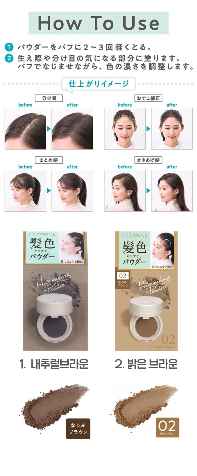 ■사용 방법 퍼프에 파우더를 2~3회 가볍게 묻힙니다.새치가 신경 쓰이는 부분(헤어라인, 가르마 등)에 부드럽게 바릅니다.퍼프로 톡톡 두드리며 자연스럽게 블렌딩하여 색 농도를 조절합니다.