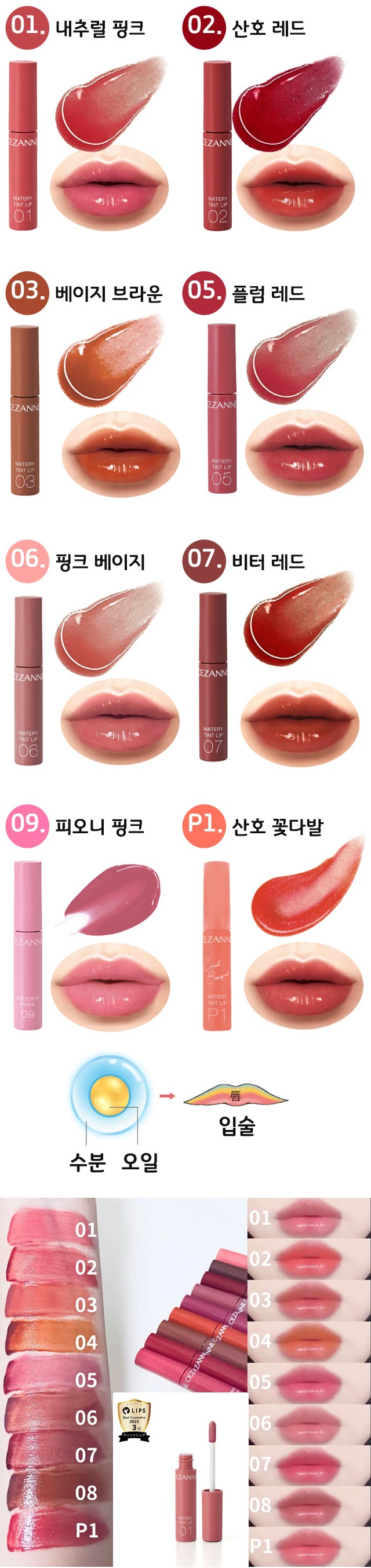 입술에 가볍게 밀착되어 끈적임 없이 촉촉한 윤기를 유지합니다. P1 : 밝고 산뜻한 코랄 01 : 여성스러운 화사한 인상을 주는 핑크 02 : 세련되고 멋스러운 인상을 주는 레드 03 : 지적이고 어른스러운 인상을 주는 브라운 05 : 세련된 인상을 주는 푸른기운의 레드 06 : 내추럴하고 단정한 인상을 주는 핑크 베이지 07 : 쿨하고 매혹적인 인상을 주는 딥 레드 09 : 한 방울의 흰빛이 더해진 듯한 연한 핑크