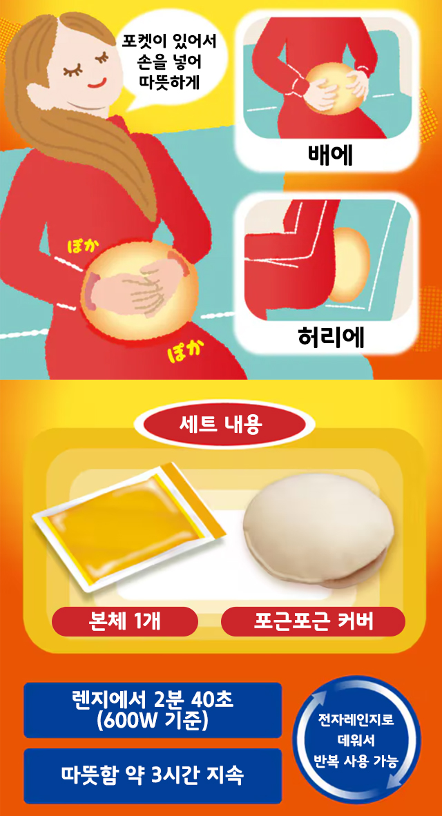전자렌지에 2~3분 데우기만 하면 따뜻함 완성 약 3시간 지속되는 온기 포켓 포함 → 손을 넣어 따뜻하게 사용 가능 말랑한 젤 타입으로 부드러운 촉감 세탁 가능한 전용 커버 포함 반복 사용 가능