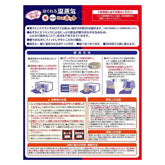 【제품 특징】 - 전자레인지에 간편히 데우기만 하면 약 30분간 기분 좋은 따뜻함이 지속됩니다. - 팥과 세라믹에서 나오는 풍부한 스팀이 허리와 복부를 부드럽게 감싸며, - 허리와 배에 잘 밀착되는 구조로 설계되었습니다. - 손끝까지 따뜻해질 수 있도록 포켓이 포함되어 있습니다. - 묶을 수 있는 벨트가 부착되어 있어 고정이 편리합니다. - 최대 365회 반복 사용이 가능합니다.