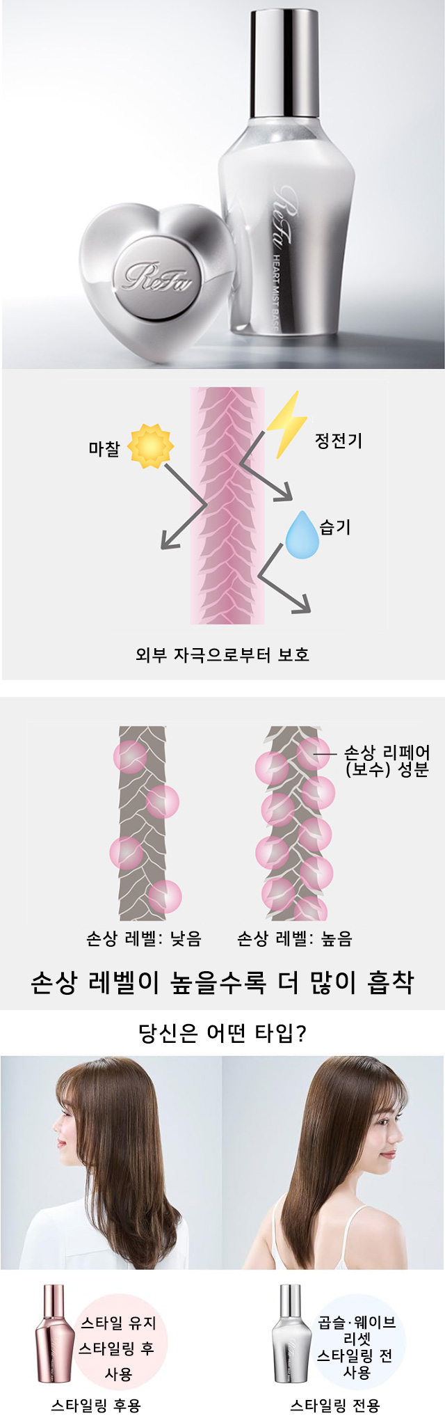 곱슬·부스스함이 고민인 모발을 위해, 스타일링 전에 사용하여 모발의 베이스를 정돈해주는 프리 스타일링용 미스트. 습기 많은 날에도 모발이 쉽게 뒤틀리지 않는 차분하고 곧은 헤어를 유지합니다.