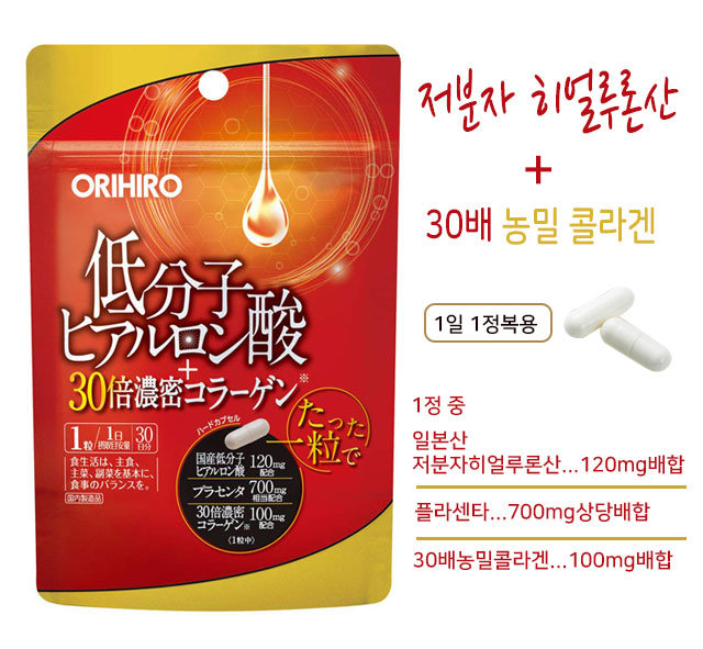 제품 특징저분자 히알루론산을 중심으로, 미용 효과가 높은 플라센타,그리고 콜라겐 특유 성분을 30배 많이 함유한 농밀 콜라겐을 배합!농밀 콜라겐이란?일반 콜라겐보다 콜라겐 특유의 **디펩티드(PO, OG: 프로릴히드록시프롤린, 히드록시프로릴글리신)**를30배 많이 함유한 콜라겐입니다.복용 특징1일 1정 섭취로 아름다움 유지에 도움을 줍니다.1정에 포함된 성분:저분자 히알루론산 120mg플라센타 700mg 상당30배 농밀 콜라겐 100mg용법 / 용량1일 1정을 기준으로, 물 또는 미지근한 물과 함께 섭취하세요.원재료명콜라겐 펩타이드(젤라틴 포함)플라센타 추출물 분말덱스트린히알루론산젤라틴결정 셀룰로스스테아린산 칼슘이산화규소인산칼슘착색료(이산화티탄) |