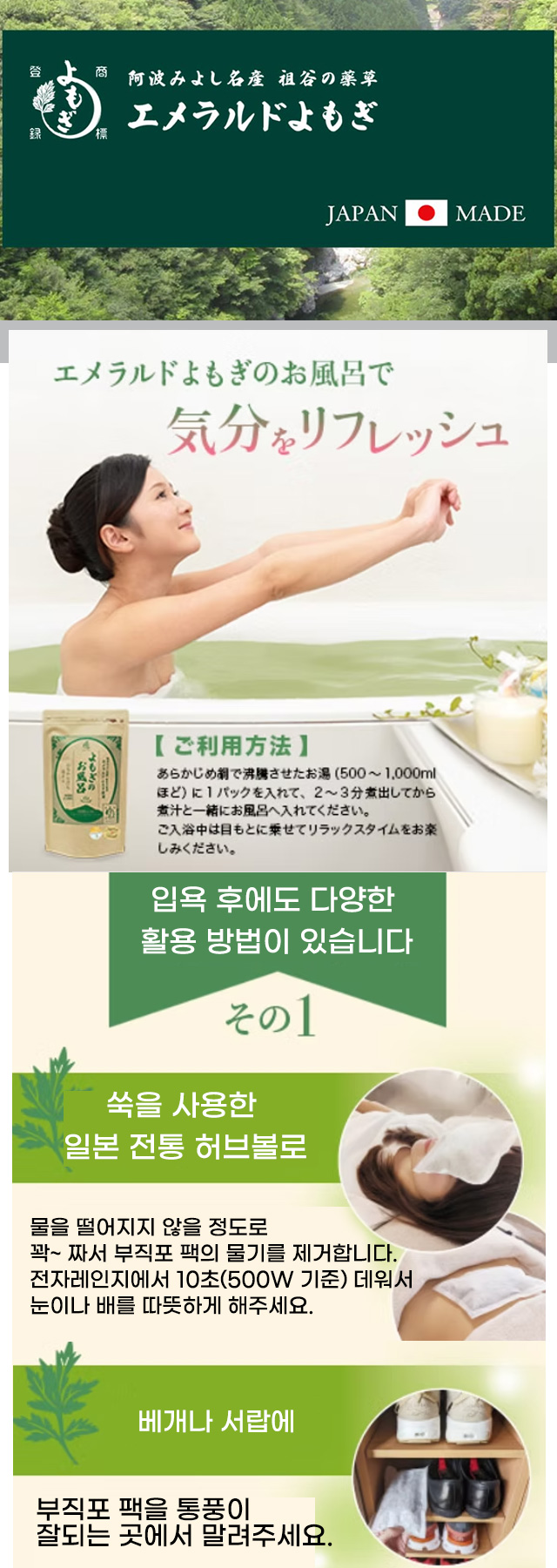 토쿠시마산 의 청정 지역에서 농약·화학비료 없이 재배한 쑥 ‘에메랄드 쑥’ 일본 쑥 100%를 사용한 프리미엄 입욕제입니다. 유도에 도움을 주는 전통 허브 배스입니다.