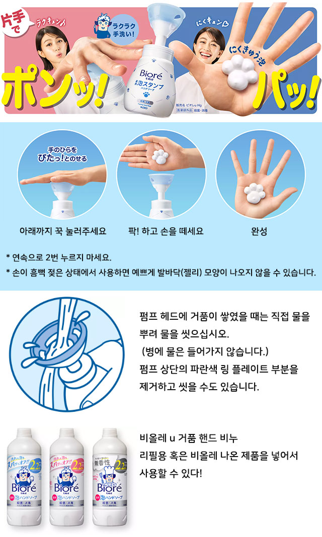 한 손으로 꾹 누르고 톡 떼기만 하면, 귀여운 젤리(발바닥) 모양 거품이 나오는 비오레u 거품 핸드솝입니다. 세정력과 헹굼력 모두 우수합니다.
