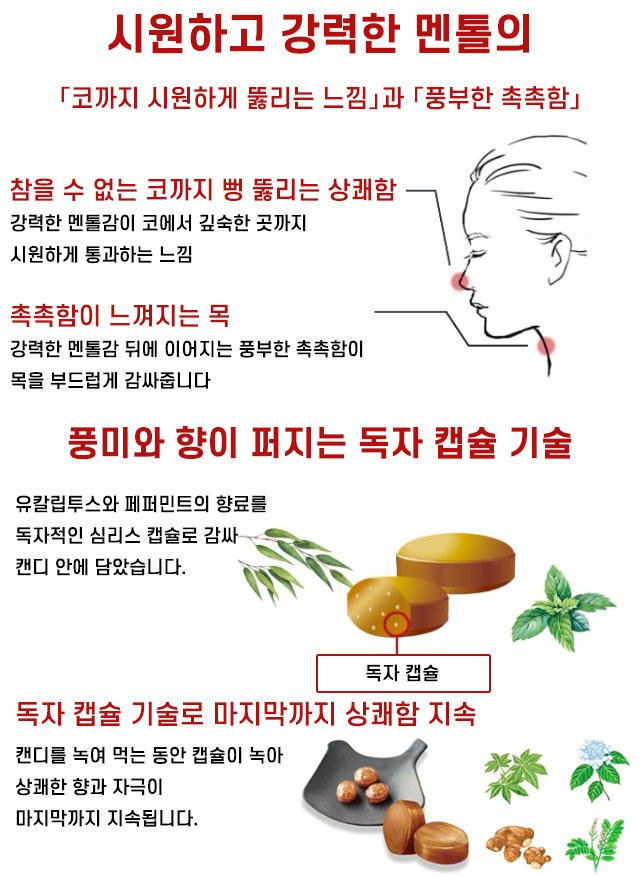 자극적인 목캔디가 부담스러운 분들을 위해, 기존의 상쾌함은 유지하면서도 부드럽고 순한 맛으로 완성한 코·목 케어 캔디입니다. 밀크 풍미와 와칸(和漢) 식물 추출물이 조화를 이루어 목을 편안하게 감싸줍니다.