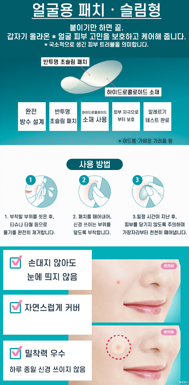 🔹 사용방법 ・부착할 부위를 씻고 티슈 등으로 물기를 완전히 제거합니다. ・패치를 떼어내어 고민 부위에 밀착되도록 붙입니다. ・일정 시간이 지난 후, 피부를 자극하지 않도록 가장자리부터 천천히 떼어냅니다.
