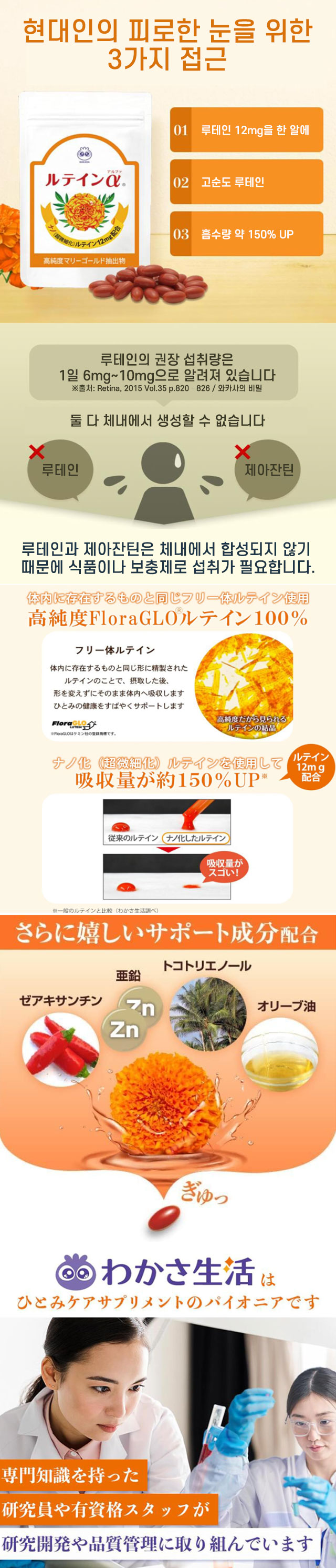 🔹 특징 나노화 공법으로 루테인 흡수 효율 강화 FloraGLO® 고순도 루테인 사용 하루 1정으로 간편한 눈 케어