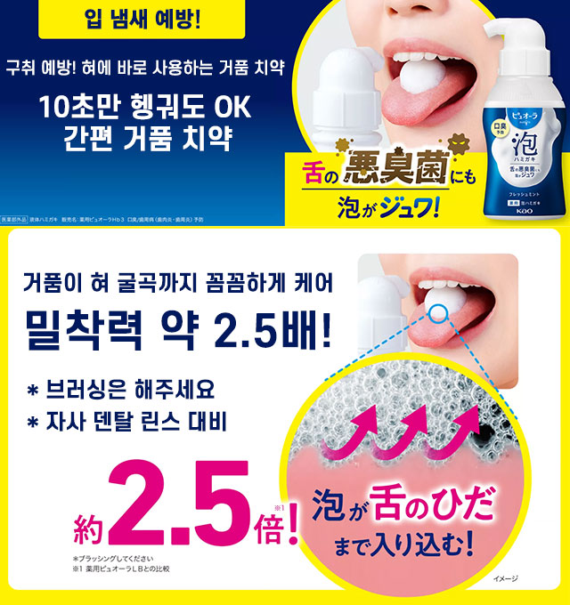 혀의 원인균까지 거품이 빠르게 퍼져 구취를 예방하는 거품형 치약입니다. 구강 케어를 완성할 수 있습니다.