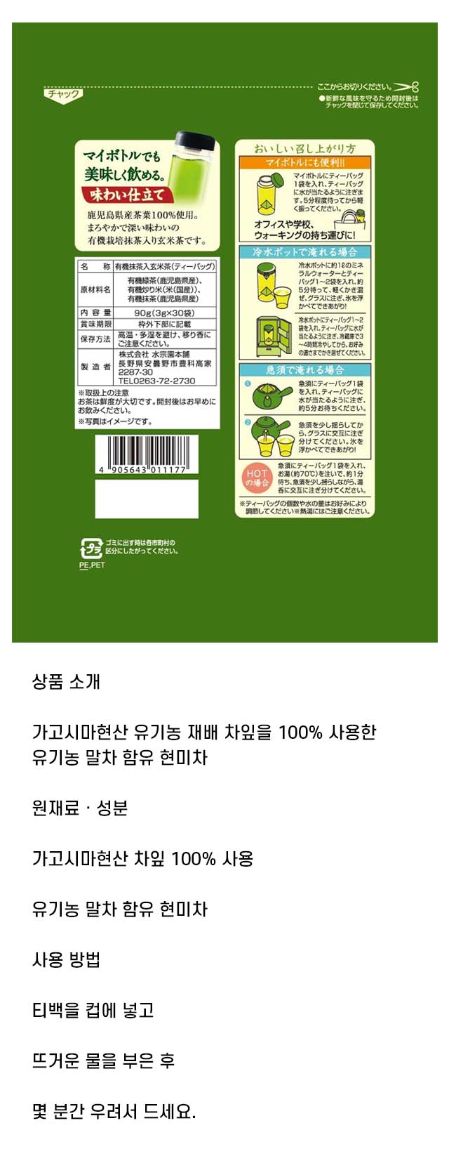 home > 일본 식품 > 커피/차 > 현미차 > 스이소엔 본점 유기농 말차 함유 현미차 티백 30포 가고시마현산 · 유기 JAS 인증