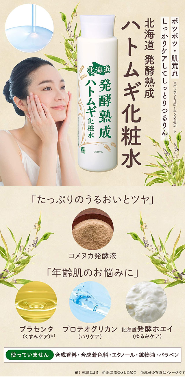 홋카이도산 하토무기를 발효·숙성 공정을 거쳐 담아낸 화장수로,