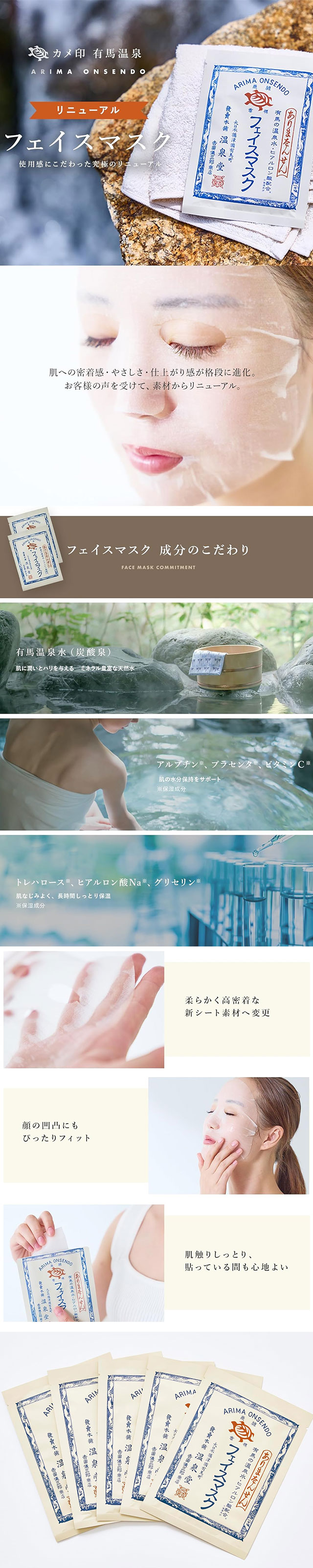 ・아리마 온천 온천수(탄산천)를 고함량으로 배합한 시트 마스크입니다. ・보습 성분을 담아 피부를 촉촉하게 케어해 줍니다. 🔹 상세 정보 ・내용량: 5팩 (1팩 1매 / 에센스 22ml) ・품목명: 페이스 마스크 ・원재료: 온천수(탄산천), 알부틴, 플라센타, 비타민C, 트레할로스, 히알루론산Na, 글리세린 ・원산지: 일본 🔹 보관방법 ・직사광선을 피하고 서늘한 곳에 보관해 주세요. ・개봉 후에는 즉시 사용해 주세요. 🔹 정보 ・색상명: 화이트 시트 ・색감 설명: 얼굴 굴곡에 밀착되는 얇은 시트 타입 → 감성 요약: 온천수로 채운 촉촉한 데일리 마스크 🔹 특징 ・아리마 온천수 약 80% 함유 ・6종 보습 성분 배합 ・극세 TCF 시트로 밀착 사용감 ⚠️ 주의사항 ・피부에 맞지 않거나 사용 중 붉어짐, 가려움 등의 이상이 나타날 경우 사용을 중지해 주세요. ・마스크나 에센스가 눈에 들어가지 않도록 주의해 주세요. ・눈에 들어갔을 경우 문지르지 말고 즉시 씻어내 주세요. ・본 제품은 물에 녹지 않으므로 변기에 버리지 마세요. ・온천 원료 특성상 특유의 향이 느껴질 수 있으나 품질에는 문제가 없습니다.