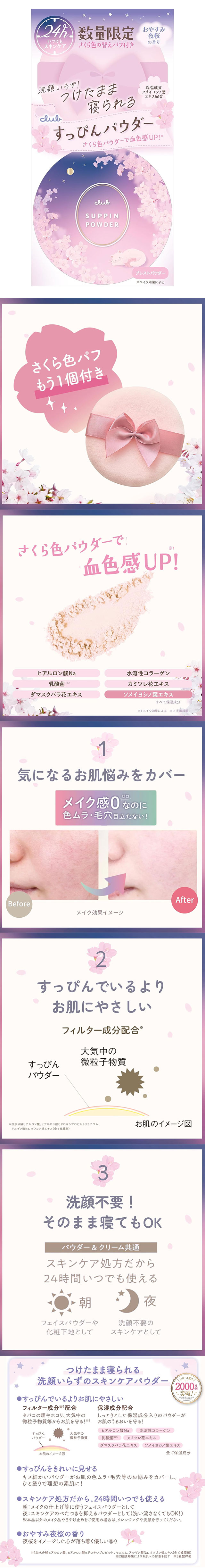 🔹 특징 ・취침 전 사용 가능한 슬리핑 파우더 타입 ・피부에 가볍게 밀착되는 산뜻한 사용감 ・기분 좋은 밤벚꽃 향기