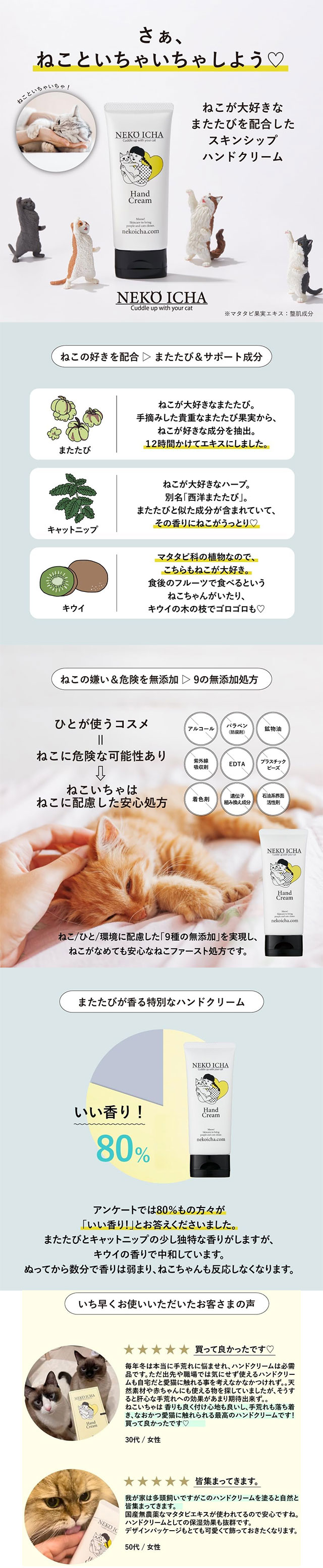 고양이와 함께 사는 사람을 위해 만든 스킨십 핸드크림입니다. 독자 개발한 마타타비(개박하) 추출물을 함유해, 바른 손에 고양이가 스리슬리 다가올지도 모르는 특별한 경험을 선사합니다. 고양이가 싫어하는 성분은 배제하고, 사람의 피부에도 순한 네코 퍼스트 처방으로 안심하고 사용할 수 있습니다. 🔹 상세 정보 ・품목명: 핸드크림 ・패키지 크기: 약 2.6 × 10 × 18.5cm ・원산지: 일본 🔹 보관방법 직사광선을 피하고 고온 또는 저온의 장소를 피해 보관해 주세요. 반려동물 및 유아의 손이 닿지 않는 곳에 보관하세요. 🔹 정보 제형 / 향: 산뜻한 크림 타입 / 마타타비 & 캐트닙에 키위 향을 더한 은은한 향 → 감성 요약: 손은 촉촉하게, 고양이는 가까이—집사와 고양이의 거리 제로 🔹 특징 ・일본산·무농약 마타타비 추출물 함유 ・고양이가 싫어하는 성분 무첨가, 9가지 무첨가 처방 ・보습과 보호를 동시에 하는 논스틱 핸드크림 ⚠️ 주의사항 ・본래의 용도 외에는 사용하지 마세요. ・피부에 이상이 있거나 맞지 않을 경우 사용을 중지하세요. ・상처, 습진 등 이상이 있는 부위에는 사용하지 마세요. ・사용 중 또는 사용 후 붉어짐, 가려움, 자극 등이 나타날 경우 사용을 중지하고 전문의와 상담하세요. ・눈에 들어갔을 경우 문지르지 말고 즉시 물 또는 미지근한 물로 충분히 씻어내세요.