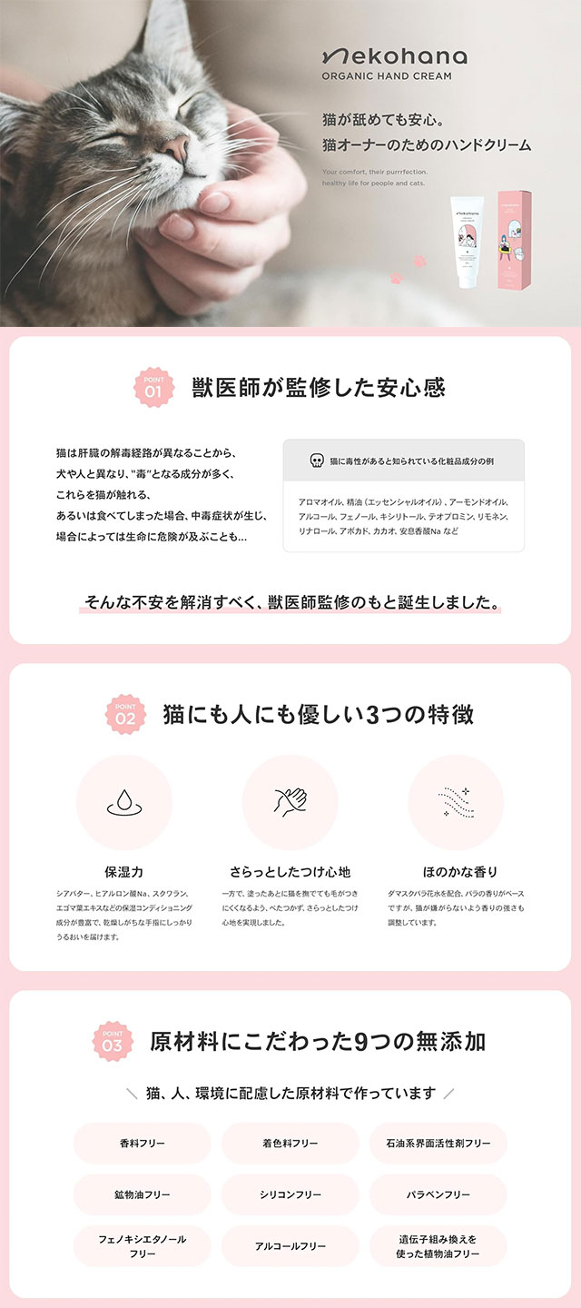 수의사가 개발한 고양이와 함께 쓰는 오가닉 핸드크림입니다. 산뜻한 사용감으로 바른 직후에도 끈적임 없이