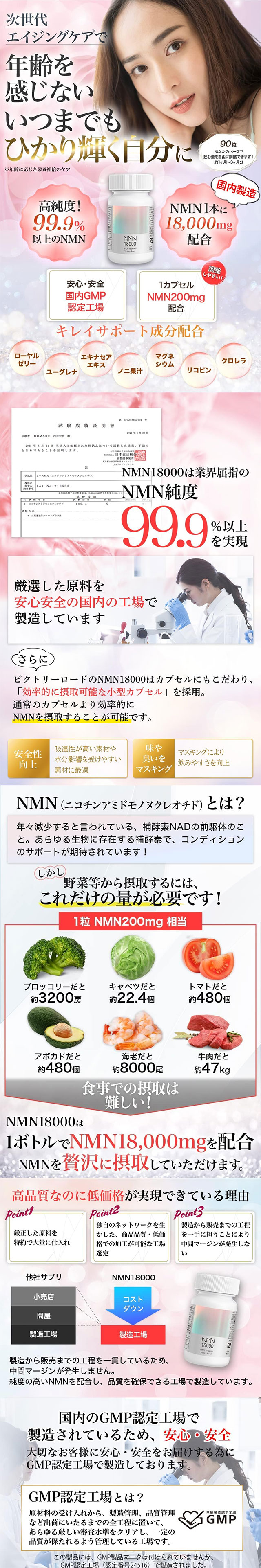 고순도 99% 이상의 NMN을 총 18,000mg 함유한 일본 제조 서플리먼트입니다.